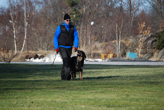 Vessla har dragits med en förkylning under veckan och har fått vara hemma ifrån hunddagis sen i måndags. Men nu börjar hon må bra igen. Så med det underbara ljuvliga vårvädret idag passade vi på. Vi packade in oss i bilen och körde ut till Volvo-området, och efter att ha lagt var sitt spår till Vessla blev det lite lydnadsträning. Vessla var ganska bra med på noterna. Fin kontakt i fria följet.